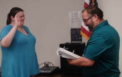 Miranda Dwyer, Labor and Industries, receives a $500 Elsie Schrader grant in aid scholarship at the May 2018 General Membership meeting.